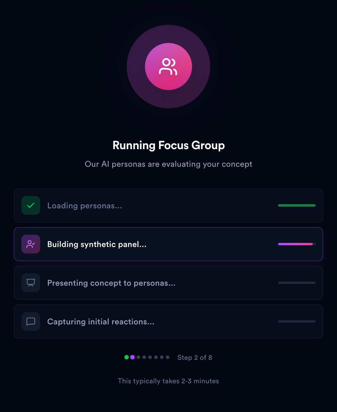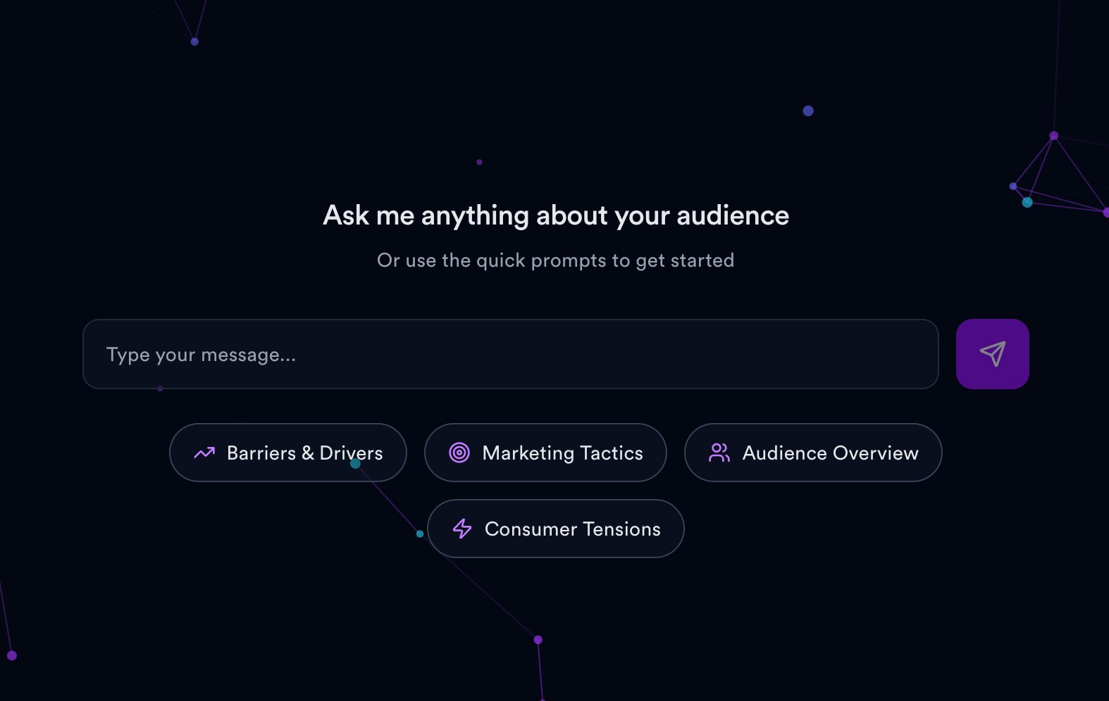 Every persona is generated from real consumer data. Our AI synthesises millions of behavioural signals and psychographic data to build personas with hundreds of attributes. Add your own customer data and they become even more precise. We've tested outputs against real consumer panels - current validation shows approximately 80% alignment on sentiment, intent, and decision reasoning.