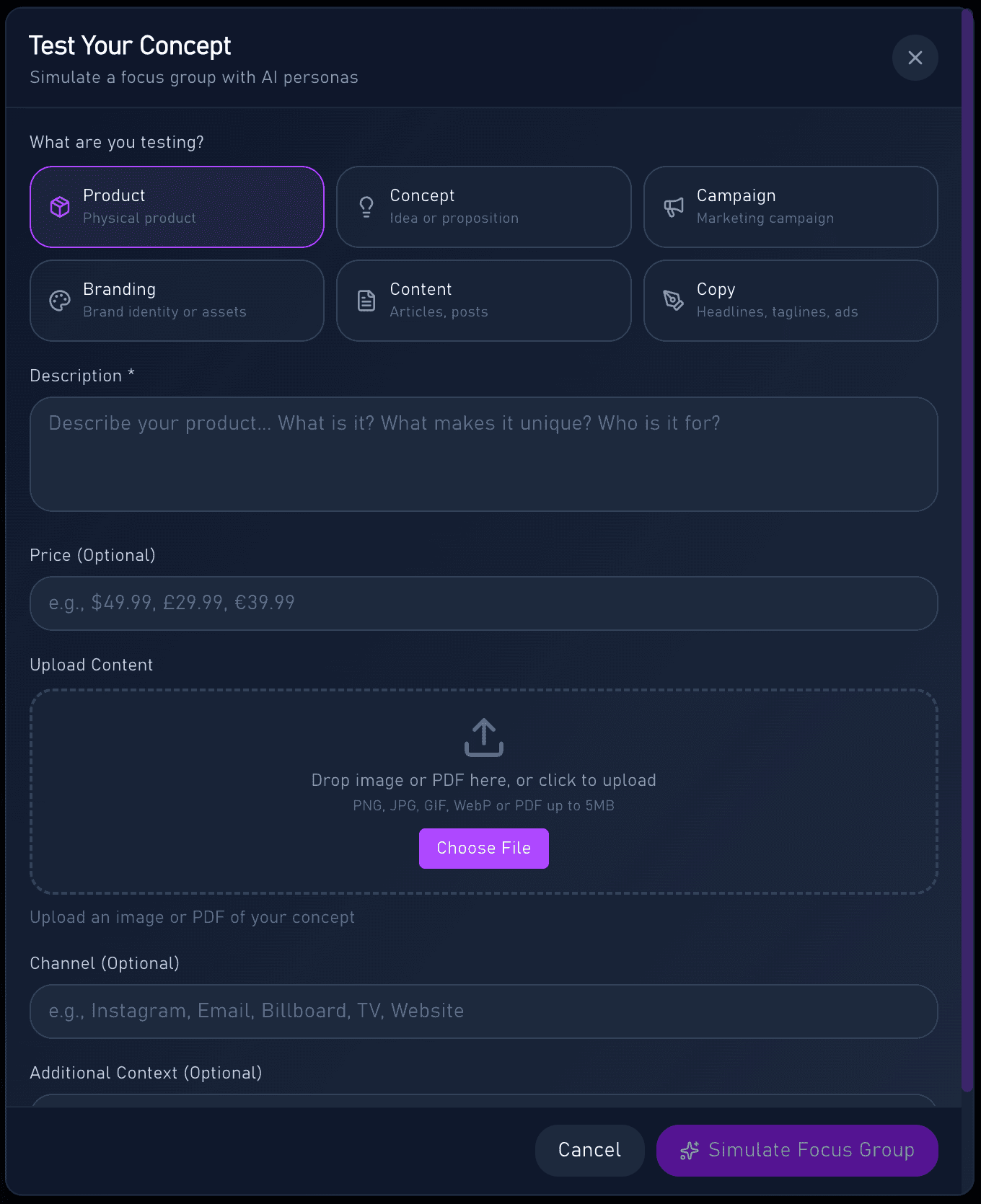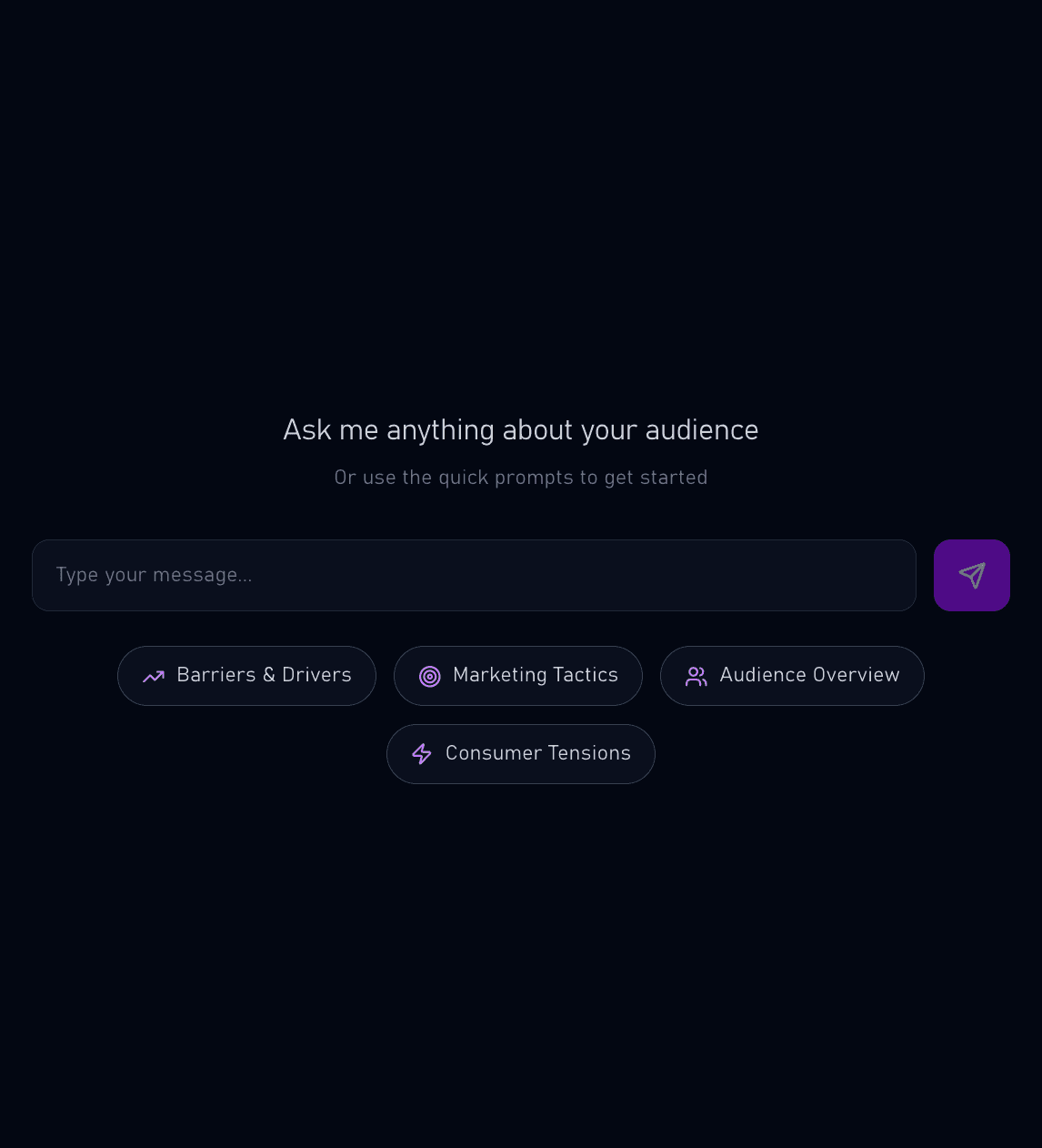 Upload your brief or type questions directly into our platform. Define your audience, category, and objectives in minutes.