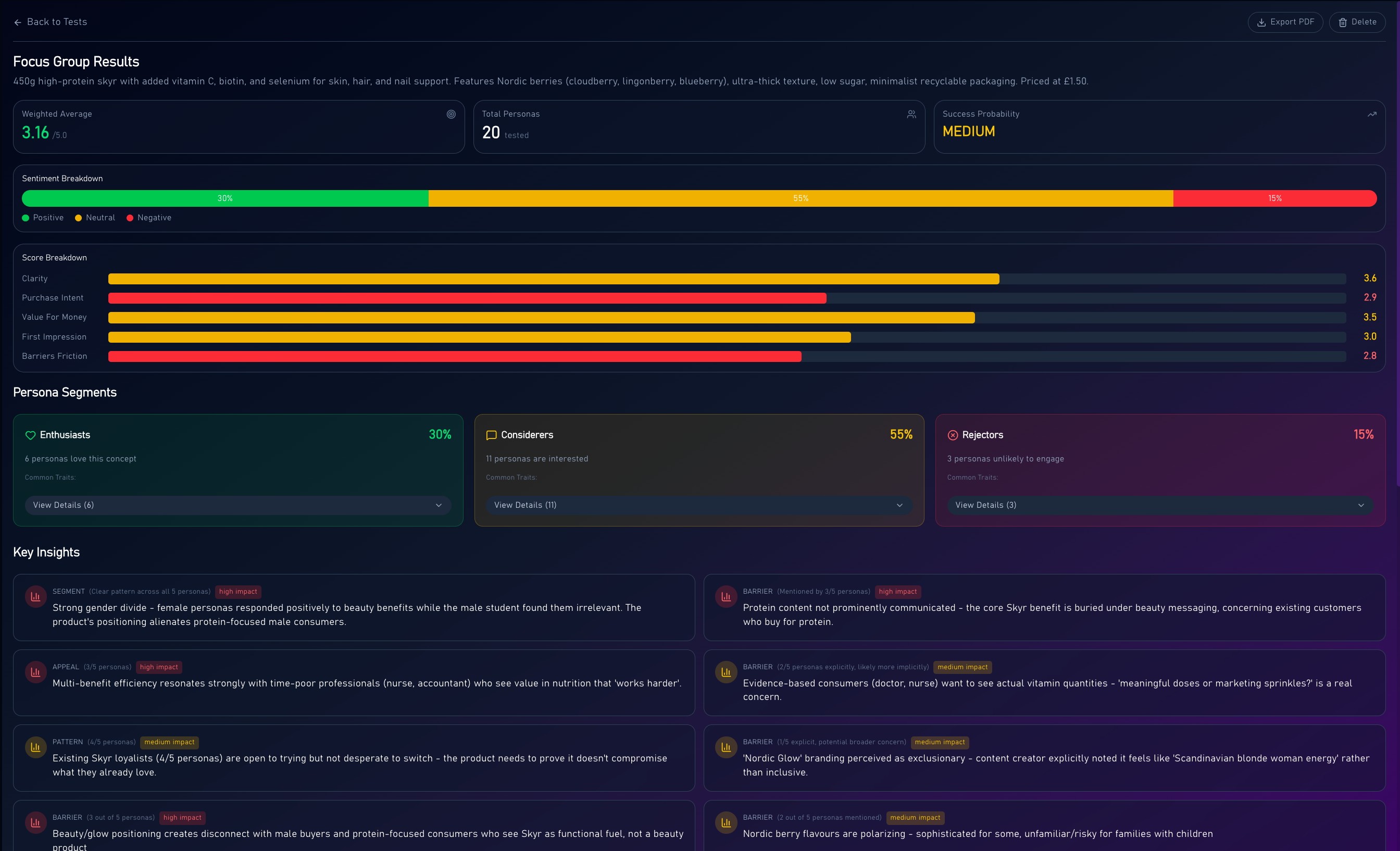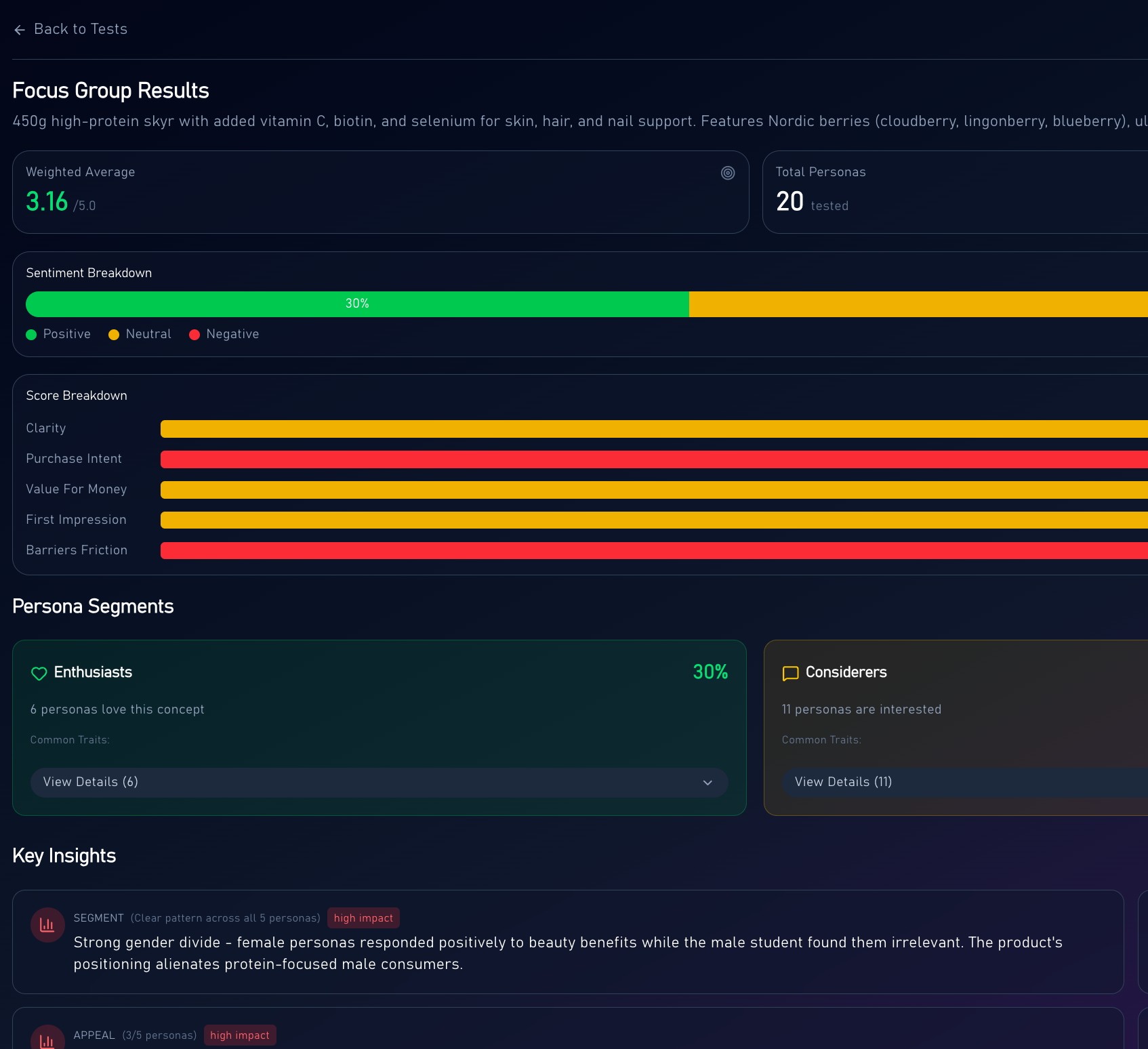 The Insight Engine surfaces citation-backed audience intelligence focused on commercial implications and the 'so what'. Concept Testing returns detailed persona responses - purchase intent scores, sentiment breakdowns, segment analysis, verbatim reactions, and key barriers. Both include actionable recommendations and clear next steps.