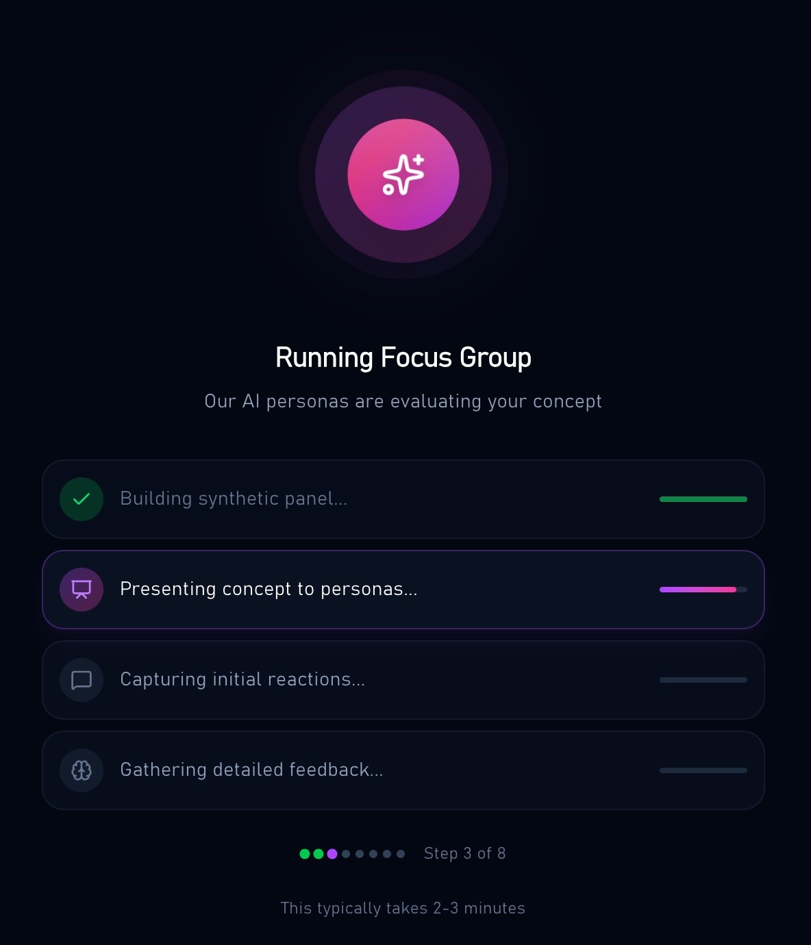 Every persona is generated from real consumer data. Our AI synthesises millions of behavioural signals and psychographic data to build personas with hundreds of attributes. Add your own customer data and they become even more precise. We've tested outputs against real consumer panels - current validation shows approximately 80% alignment on sentiment, intent, and decision reasoning.